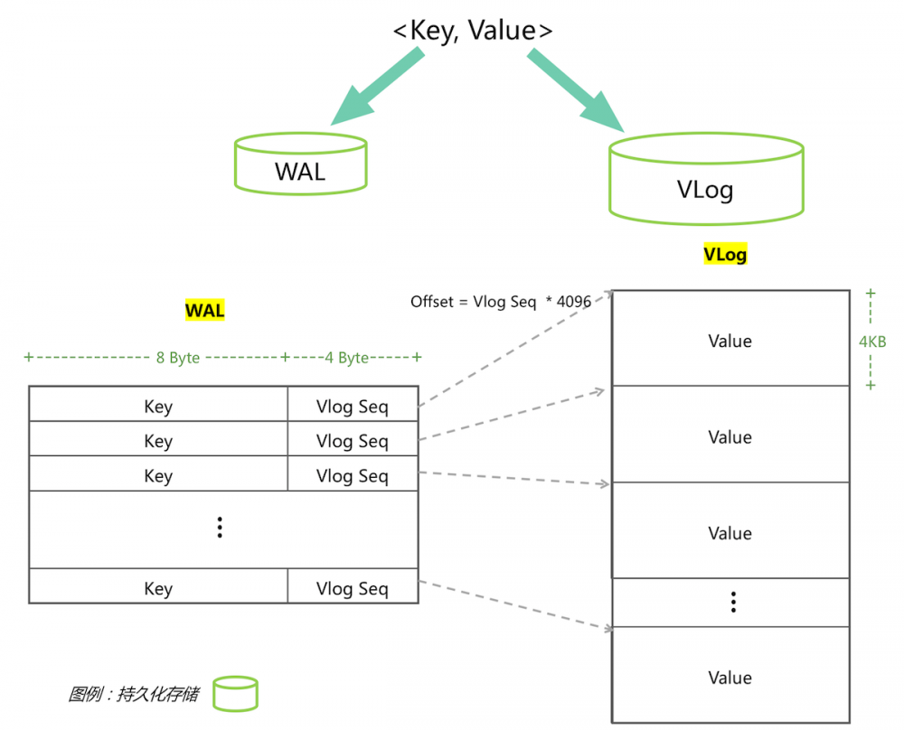 wal(Write Ahead Log)存key和value在vlog中的offset,vlog是顺序写入的value,wal和vlog都是append-only的定长写入,所以wal只用存vlog的sequence,vlog seq用4byte Int表示存储,大尾端/小尾端程序自己定,然后乘以4096就是在vlog文件中的偏移量。关于vlog的gc问题题目不要求删除故不考虑。