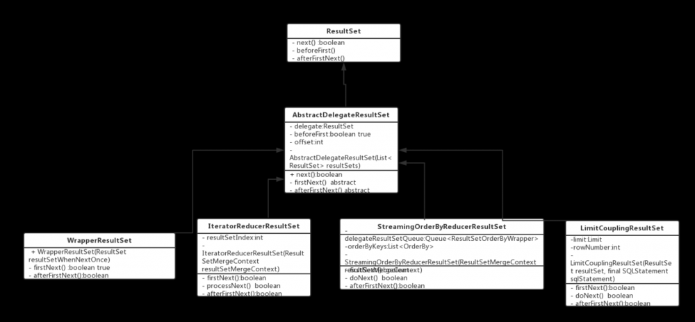 至此,装饰模式需要的类已经构建好了,分别是:LimitCouplingResultSet处理分页、StreamingOrderByReducerResultSet处理排序、WrapperResultSet