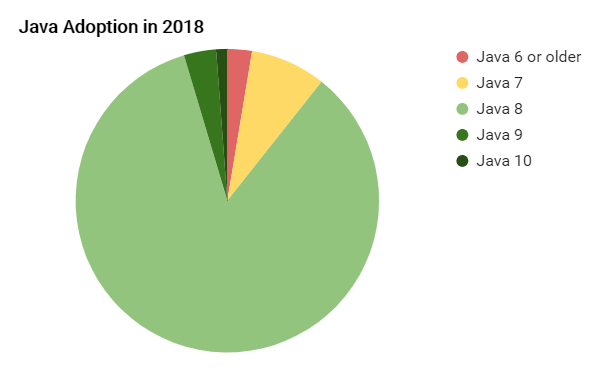 Java9和Java10的采用率依然非常低,分别都只有低于5%的占比。