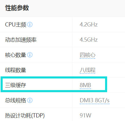 我们都知道CPU 和 内存是计算机中比较核心的两个东西,它们之间会频繁的交互,随着CPU发展越来越快,内存的读写的速度远远不如CPU的处理速度,所以CPU厂商在CPU上加了一个 高速缓存,用来缓解这种问题。我们在看CPU硬件参数的时候,也会看到有这样的参数: