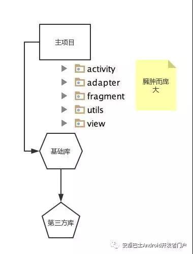 你的成长是建立在公司的成长上,随着公司业务发展庞大,种种缘由业务伴随着也会出现分支独立,需要某些子业务线独立出App提供专业的服务和体验;需要撒播种子开花结果,原先的子模块可能变成独立App,所以发现目前的架构是没法实现,对,走过来,请在菩提树下思考;其根本缘由就是组件化不完全导致的。其中最大问题就是主项目模块涉及到大量的以前最早的业务代码和功能,现在最迫切问题是需要把主项目的业务剥离变成一个业务子模块加一个纯粹的项目骨架,其中项目骨架必须上升一级变成新的主项目模块,此主项目模块包含项目公共业务。说白点,把项目骨架套在其他子模块就是一个独立的App可以运行;