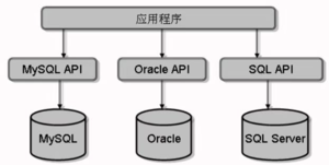 在没有JDBC之前,我们需要编写不同的程序对接不同厂商的数据库系统,像下图所示,需要针对不同的数据库api编程,可想而知,当我们需要更换数据库系统而产生的大量重复工作,增加不必要的开发成本