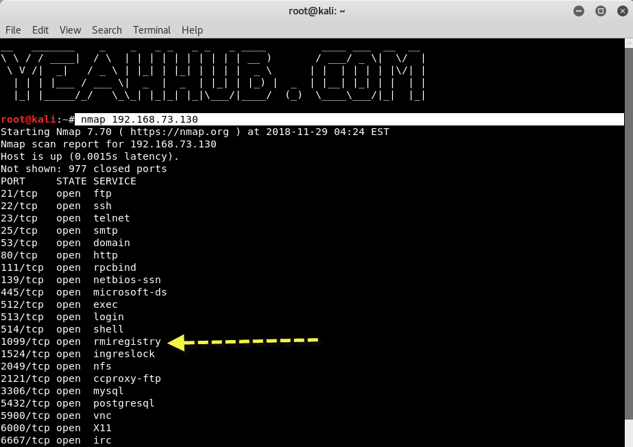 192.168.73.130是我们的靶机(metasploitable2),靶机上安装了Java RMI服务(rmiregistry),运行在1099端口上,你也可以通过nmap扫描结果来看这个端口是开放的。