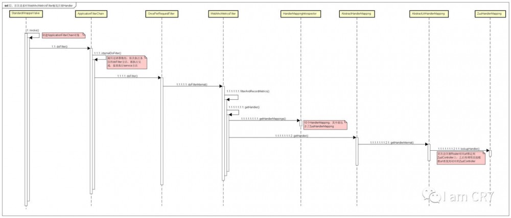 如此一来,请求http://localhost:8558/role-api/info/7,就会由AbstractUrlHandlerMapping的lookupHandler方法,找到ZuulController。虽然WebMvcMetricsFilter对找到的ZuulController只是做统计相关的处理,但是这为后面讲述DispatcherServlet正式处理请求,由Zuul转发到后端微服务,打下了很好的基础。