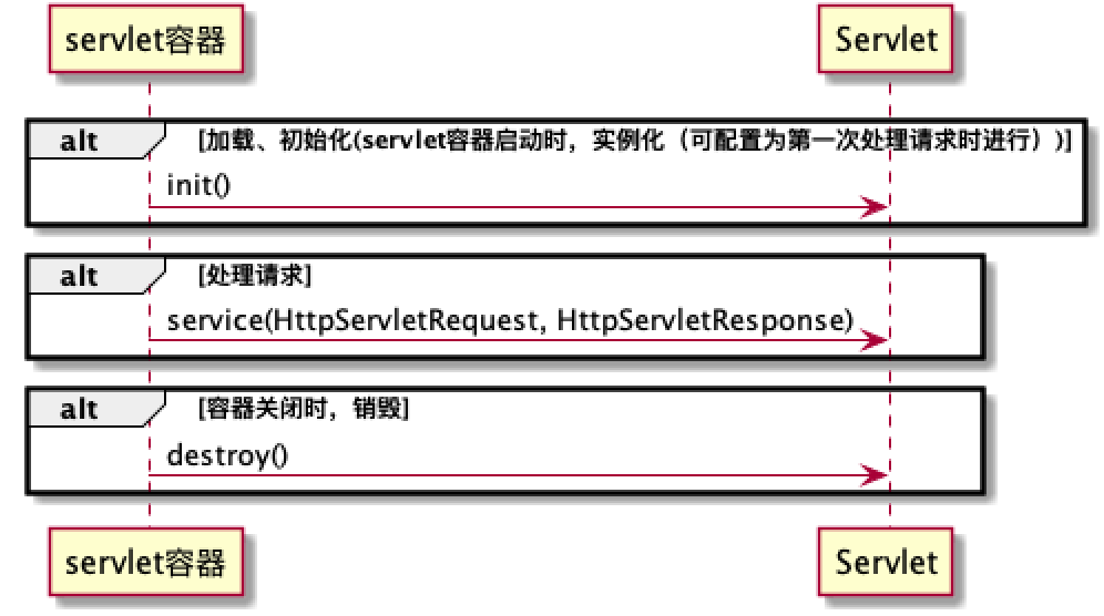 该生命周期可以通过Servlet接口中的API来表示:init、service、destroy