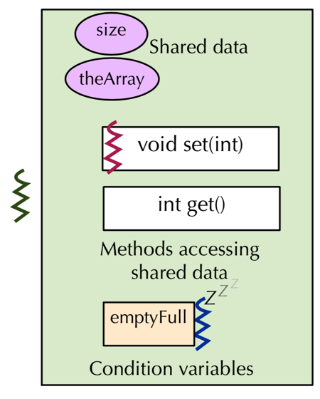 上图表示蓝色的线程在调用监控器的 get 方式时,数据为空,因此开始等待 emptyFull 条件;紧接着,红色线程调用监控器的 set 方法改变 emptyFull 条件,这时