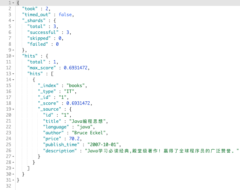 must 下面的查询条件,相当于 AND 或者 && should 下的查询条件,匹配不出来也没事。相当于 OR 或者 || must 相反,必须不满足 must_not 下面的查询条件,相当于 !== must 一样,但是不会打分,也就说不会影响文档的 _score 字段 现在,我们想要查询:书籍作者( author )是 葛一鸣 ,书籍名称( title )里包含 java 的书籍,价格( price )不能高于 70 低于 40 ,并且书籍描述( description )可以包含或者不包含 虚拟机 的书籍。