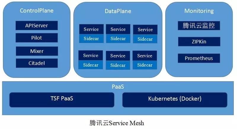 从业务架构图可以看出,业务要求 TSF 可以支持其部署在自研 PAAS 以及 Kubernetes 的容器、虚拟机以及裸金属的服务都可以通过 Service Mesh 进行相互访问。