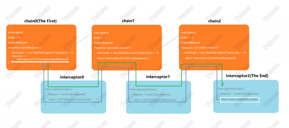 从源码中可看出,所有拦截器都保存在同一个数组中,然后新建一个 chain ,并将该数组存储到这个 chain 中。这个 chain ,就是启动整个拦截器执行链的头结点。具体过程如下: