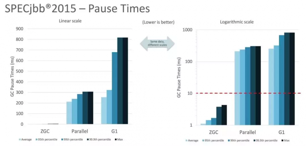 停顿时间在10ms以下,10ms其实是一个很保守的数据,在SPECjbb 2015基准测试,128G的大堆下最大停顿时间才1.68ms,远低于10ms,和G1算法相比,也感觉像是在虐菜。