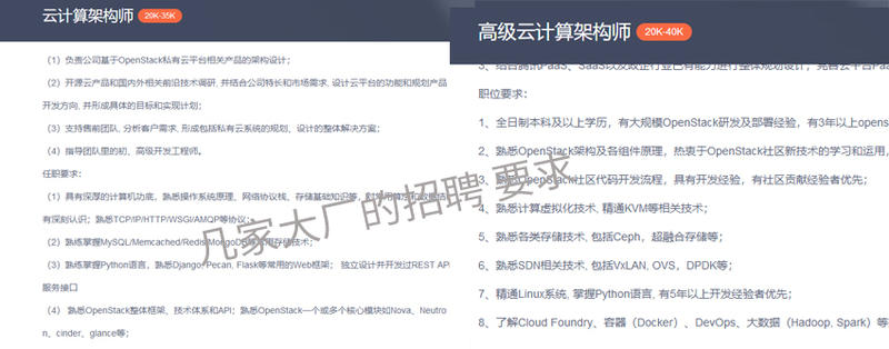 根据雇主在国内招聘网站上列举的需求显示,大厂对技术人员的 OpenStack 了解程度非常在乎,要求具备 OpenStack 运维经验并熟悉其架构原理,掌握 Python 编程语言几乎是必备要求,熟悉虚拟化和容灾备份等策略,Docker 和 Kubernetes 同样是热词之一。