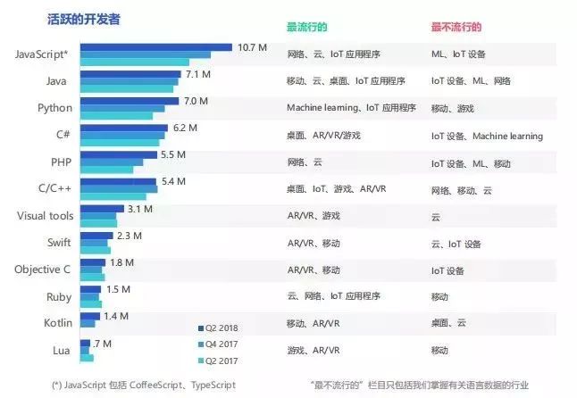 报告面向全球所有类型的程序员,对使用每种主要编程语言的活跃开发者数量进行了最新的估计。其中,JavaScript 仍是最流行的编程语言,Python 流行程度接近 Java。