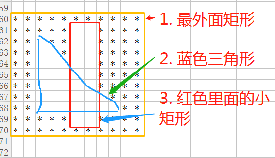 如上图, 可以看到一共有3个图形, 最外面的*号构成的图形, 里面蓝色的由空白构成的三角形