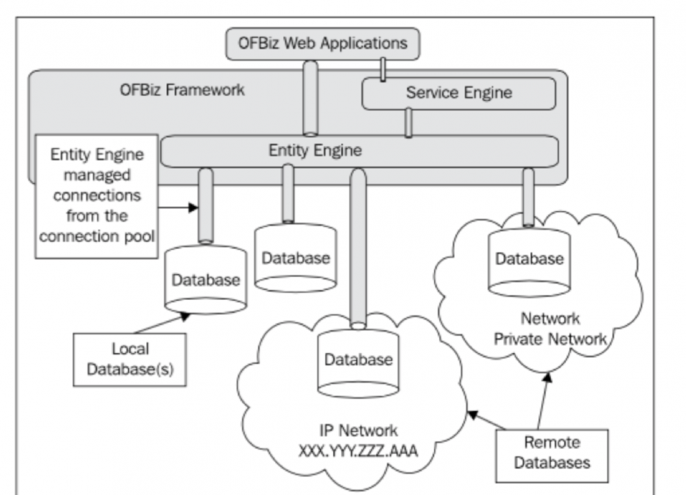 从架构图中可以看到ofbiz的所有app都构建在framework之上。framework的核心就是ServiceEngine(服务引擎)、EntityEngine(实体引擎)。实体引擎对于数据库的种类支持都非常健全。