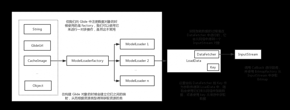 以上面我们自定义图片加载方式的过程为例,这里我们自定义了一个资源类型 CacheImage ,并通过自定义 GlideModule 指定了它的加载实现是我们自定义的 ImageLoader 类。然后,在我们自定义的 ImageLoader 中,我们指定了获取该资源的缓存的键的方式和从数据源中记载数据的具体实现 HttpUrlFetcher 。这样,当 Glide 要加载某个 CacheImage 的时候,会先使用该缓存的键尝试从缓存中获取,拿不到结果之后使用 HttpUrlFetcher 从网络当中获取数据。从网络中获取数据的时候会得到 InputStream,最后,再调用一个回调类,使用 BitmapFactory 从 InputStream 中获取 Bitmap 并将其显示到 ImageView 上面,这样就完成了整个图片加载的流程。