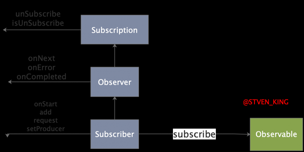 Observable 和 Subscriber 通过 subscribe() 方法实现订阅关系,从而 Observable 可以在需要的时候发出事件来通知 Subscriber 。