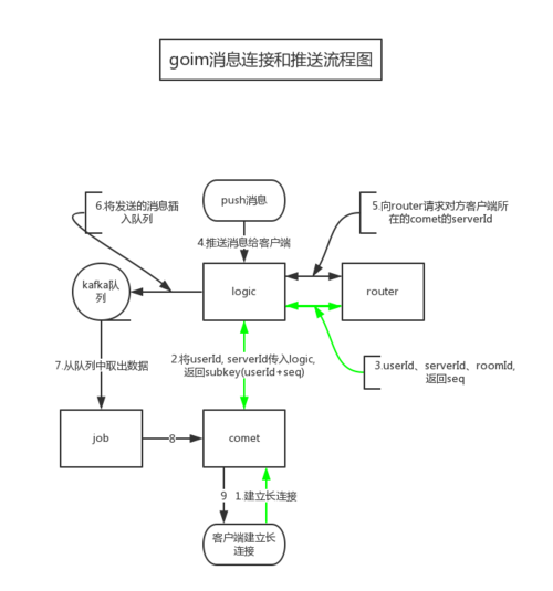 5.在长连接的时候comet->logic->router,而不是comet->router,这样是为了可以在逻辑服务器中获取其他用户状态、未读消息等,这样确实使得comet简单了,且不会有一致性问题。