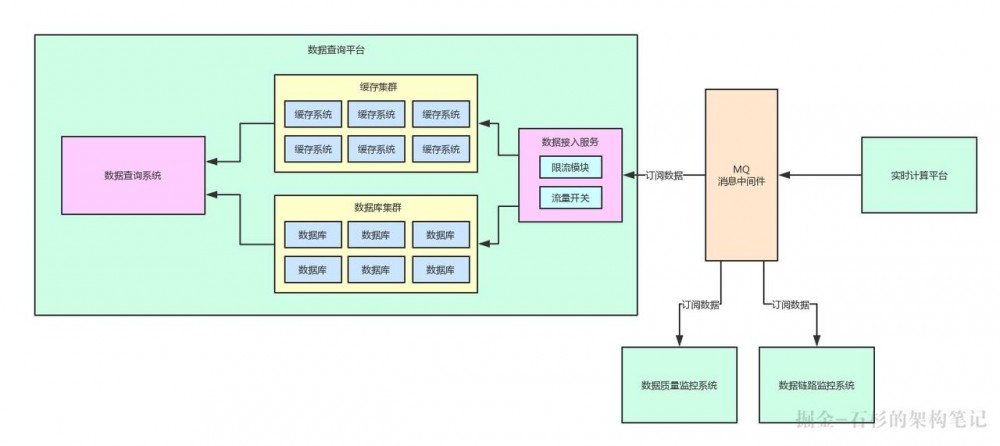 然后,数据查询平台、数据质量监控系统、数据链路追踪系统,各个系统都需要那个数据计算结果,都会去订阅里面的数据。