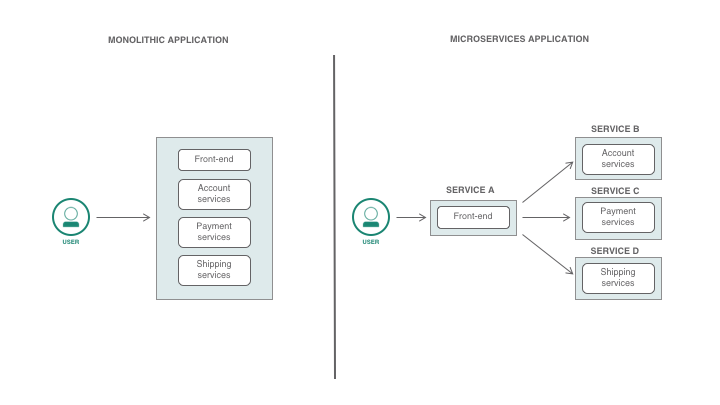 首先,什么是微服务?微服务是将应用程序拆分为多个服务的一种架构类型,这些服务具备构成整个应用程序的细粒度功能。每个微服务将具备针对您的应用程序的不同逻辑功能。与应用程序的所有组件和功能都在单个实例中的单体架构相比,微服务是应用程序架构领域一种更为现代的方法。您可以参考下图中单体架构与微服务架构的比较情况。