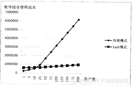 在软件初期,SaaS模式需要投入的软件综合使用成本会比传统模式高,但随着客户数的增加,SaaS模式的“规模效应”的逐渐形成,其综合使用成本上升幅度不大,并逐步趋于平稳,反观传统模式,随着客户数的增加,所需投入的软件综合使用成本一直以恒定的增幅上升。