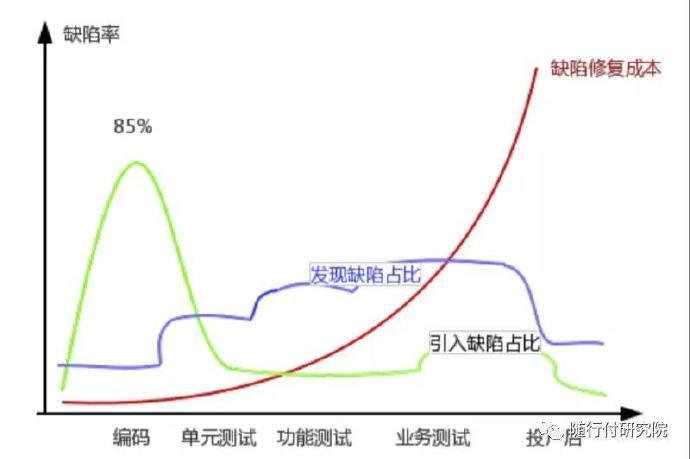 85%的缺陷是代码阶段产生的,单元测试阶段可以发现绝大部分软件缺陷。同时软件产品的缺陷发现的越早往往会大大的降低其开发的投入成本,其缺陷的发现时间与修复缺陷的成本如下图中红色曲线。红色曲线表明随着软件开发的进行,漏洞越早发现,其修复的成本越低,并且其修复成本与开发进度的上升趋势越在后期越接近于指数上升。