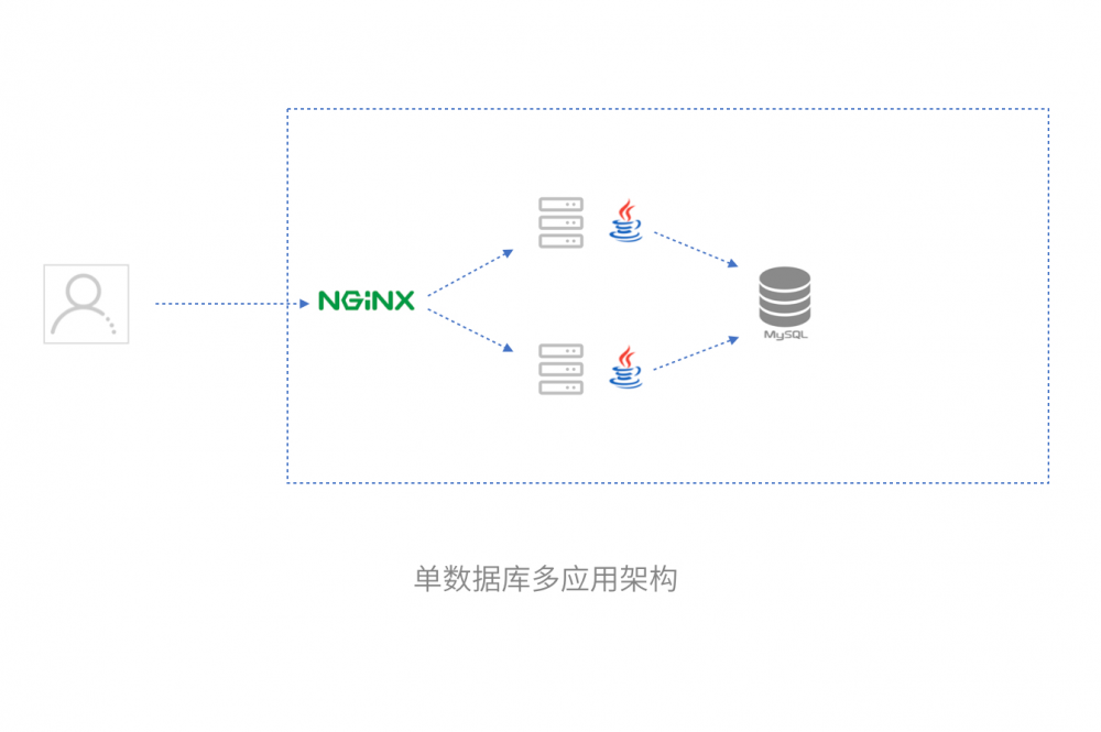 回到我们的架构问题上来,如果我们需要多台服务器响应更多的用户,同时也要保证数据的一致性。根据数据库的范式理论,数据的冗余性越低数据的一致性就越高。因此我们的第一步方案可以剥离为多个应用服务器处理用户的请求,一台数据库服务器来集中处理数据的读写,这样就能够达到分摊服务器压力的同时也能保证数据的正确。