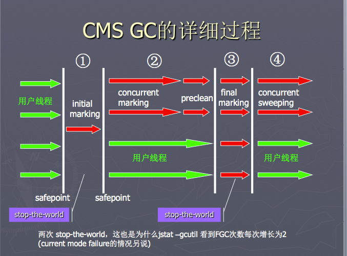 CMS 相比于 ParallelGC,支持并发式的回收,虽然个别环节还是需要 STW,但相比之前已经小了很多;另一点不同是 old 代在 sweep 后,没有 compact 过程,而是通过 freelist 来将空闲地址串起来。CMS 具体流程还是参考下面的文章: