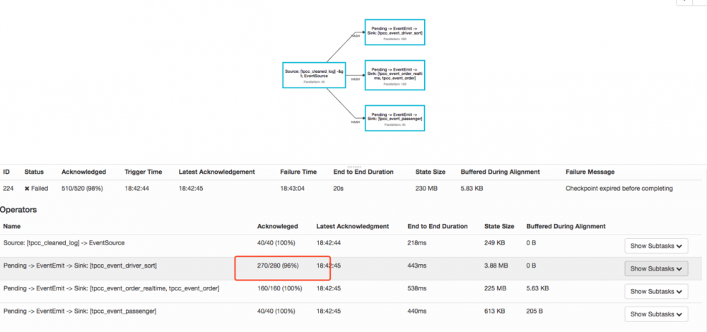 查看ui上的失败checkpoint的detail,可以看到失败的是 Pending -> EventEmit xxx 这个算子的10个subtask。