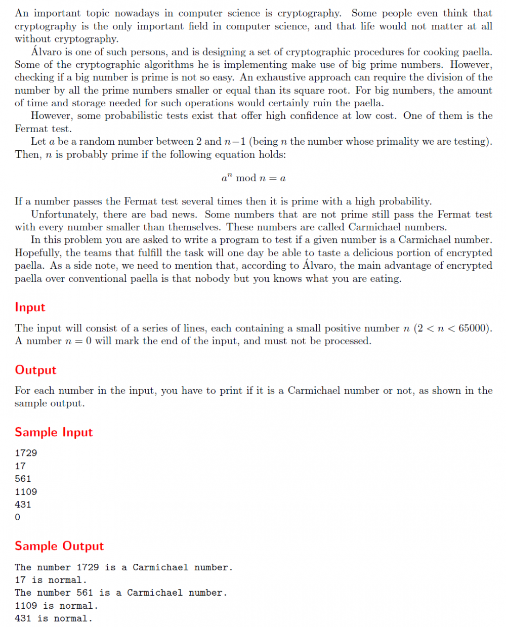 题目大意是说对于任意的$1 < x < n$都有$x^n/equiv x(mod n)$成立的合数$n$称为Carmichael Number,对于给定的整数$n$,判断它是不是Carmichael Number