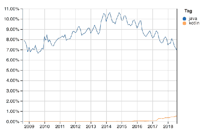 Stackoverflows上的趋势图显示Java从2015年以后走下坡路,而Kotlin开始上升。该图形中的Java趋势不断下降,Java很容易失去其作为一种非常流行的编程语言的地位。Java会逐渐趋于衰落?并且会有很多不同的语言取而代之吗?