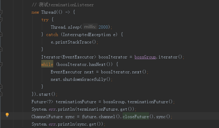 同样, future.channel().closeFuture().sync() 这段代码也将不会阻塞住了,调用 sync.get() 也会返回 null 。