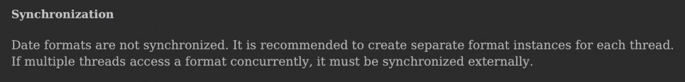 SimpleDateFormat 是 Java 中一个相当常用的类,该类用于对日期字符串进行解析和格式化,但如果使用不当会导致非常微妙和难以调试的问题,因为它不是线程安全的,在多线程环境下调用 format() 和 parse() 方法很容易产生问题。就像上面我一旦使用 JDK8 的 parallelStream() 来遍历,它就不好使了。