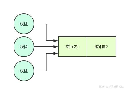 如上图,首先是很多线程需要写缓冲区1,然后是缓冲区1写满之后,就会由写满的那个线程把缓冲区1的数据刷入磁盘文件,其他线程继续写缓冲区2。