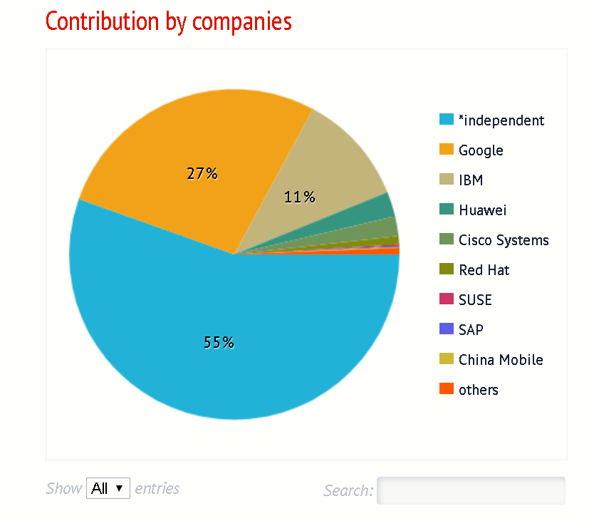 Istio 开源项目由 Google 和 IBM 主导,根据 http://stackalytics.com 网站的统计,该社区代码 Commits 厂商排名如下:
