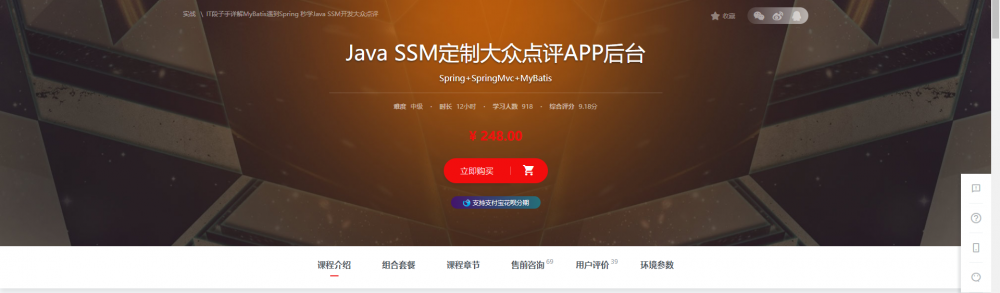 视频原价 248人民币 ,如有条件,极力推荐大家购买正版课程: Java SSM定制大众点评APP后台 ,希望各位热爱编程的小伙伴能一同致力创建一个良好的互联网学习氛围。