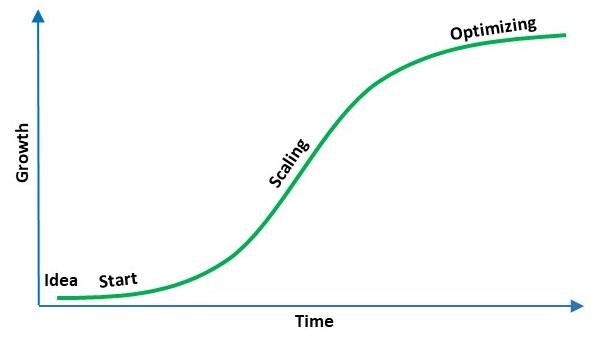 Shoup 认为,大多数公司和产品的常见演化曲线包括构思和启动阶段,分布式系统可能还包含伸缩阶段,以及优化阶段: