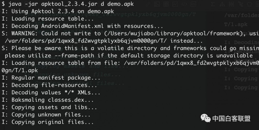 $ java -jar apktool_2.3.4.jar d demo.apk I: Using Apktool 2.3.4 on demo.apk I: Loading resource table... I: Decoding AndroidManifest.xml with resources... S: WARNING: Could not write to (/Users/wujiabo/Library/apktool/framework), using /var/folders/pd/1qwx8_fd2wvgtpklyxb6qjvm0000gn/T/ instead... S: Please be aware this is a volatile directory and frameworks could go missing, please utilize --frame-path if the default storage directory is unavailable I: Loading resource table from file: /var/folders/pd/1qwx8_fd2wvgtpklyxb6qjvm0000gn/T/1.apk I: Regular manifest package... I: Decoding file-resources... I: Decoding values */* XMLs... I: Baksmaling classes.dex... I: Copying assets and libs... I: Copying unknown files... I: Copying original files...
