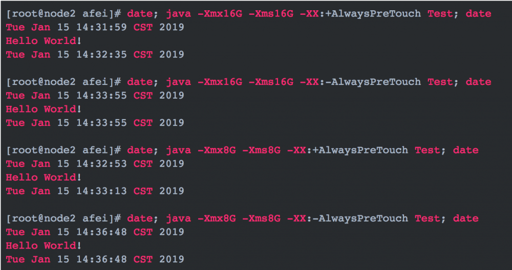 配置 -XX:+AlwaysPreTouch 参数可以优化这个问题,不过这个参数也有副作用,它会影响启动时间,那影响到底有多大呢?请接着往下看。