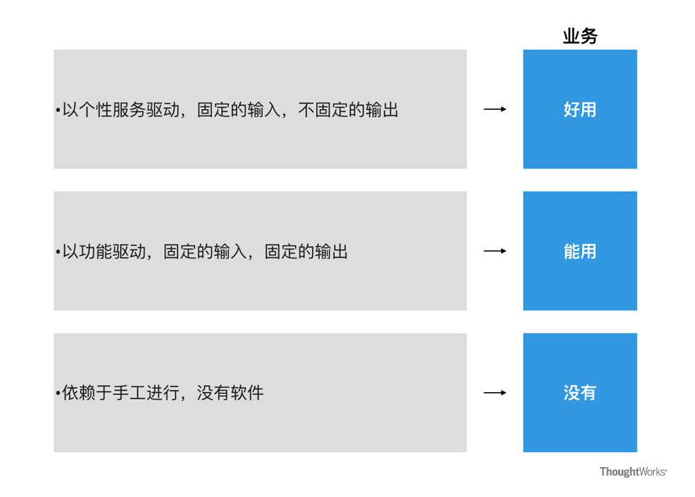 业务不会总停滞不前,因为人的生活会改变,想要的体验会改变,所以业务系统的功能会跟着改变,当我们发现数据可以逐步变成通用服务提供给业务系统的时候,就会思考,数据是否可以变成个性化服务提供给终端用户?例如不一样的得到不一样的推荐?这是一个非常简单的例子。但是当越来越多这样的服务之后,组合创造的可能性会变高,组合带来的个性化体验会更好,这就是数据服务的创造业务的阶段。
