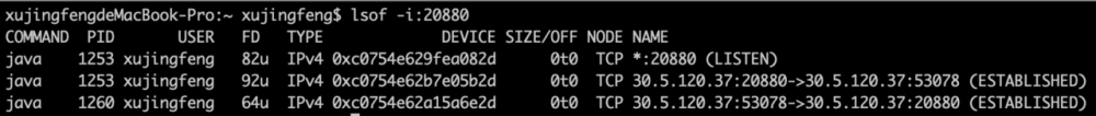 前面已经提到过,追求性能时,必然会选择使用长连接,所以借助 Dubbo 可以很好的来理解 TCP。我们开启两个 Dubbo 应用,一个 server 负责监听本地 20880 端口(众所周知,这是 Dubbo 协议默认的端口),一个 client 负责循环发送请求。执行 lsof -i:20880 命令可以查看端口的相关使用情况: