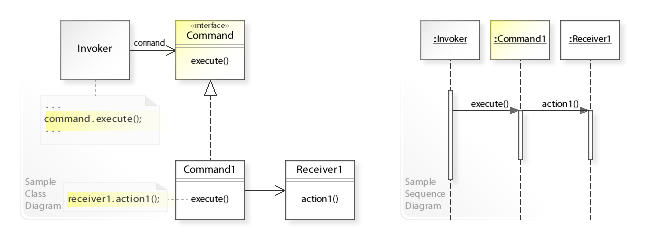 从上方的时序图中可以看出运行的顺序,Invoker执行execute方法,调用Command1对象,Command1执行action1方法调用Receiver1对象。