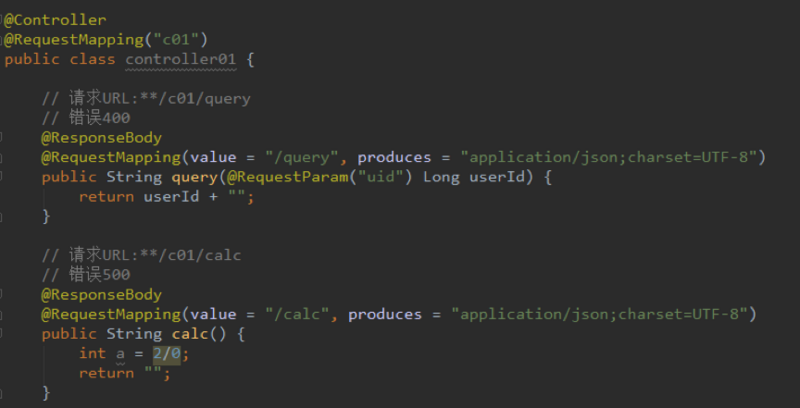 在后面的讲解中,主要以HTTP错误码:400(请求无效)和500(内部服务器错误)为例,先看一下测试代码以及没有任何处理的返回结果,如下: