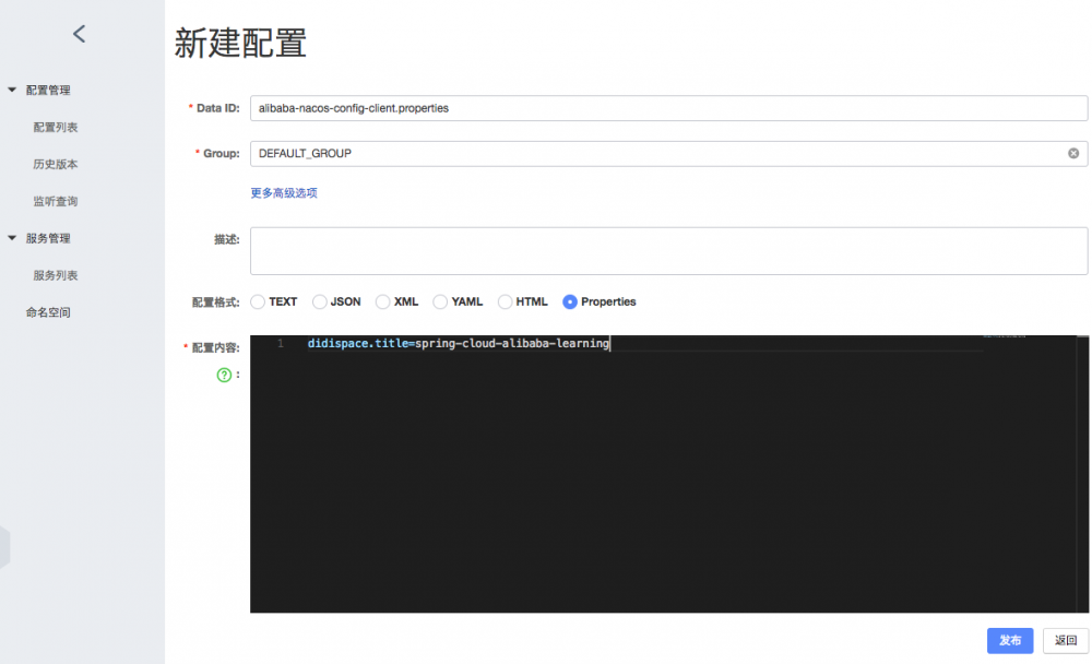 Data ID :填入 alibaba-nacos-config-client.properties Group :不修改,使用默认值 DEFAULT_GROUP 配置格式 :选择 Properties 配置内容 :应用要加载的配置内容,这里仅作为示例,做简单配置,比如: didispace.title=spring-cloud-alibaba-learning 第一步:创建一个Spring Boot应用,可以命名为: alibaba-nacos-config-client 。