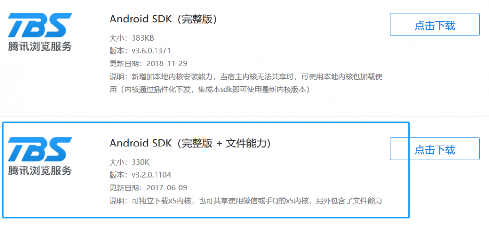 腾讯官方提供的x5内核有两个版本,这里选择具有文件能和的sdk: