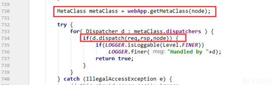大致意思是,会得到 MetaClass 的一个对象,然后对请求包进行轮询调用其中的 dispatcher.disspatch,这个 dispatcher 就是一个个“节点”下的小路由,比如说一个请求的url: