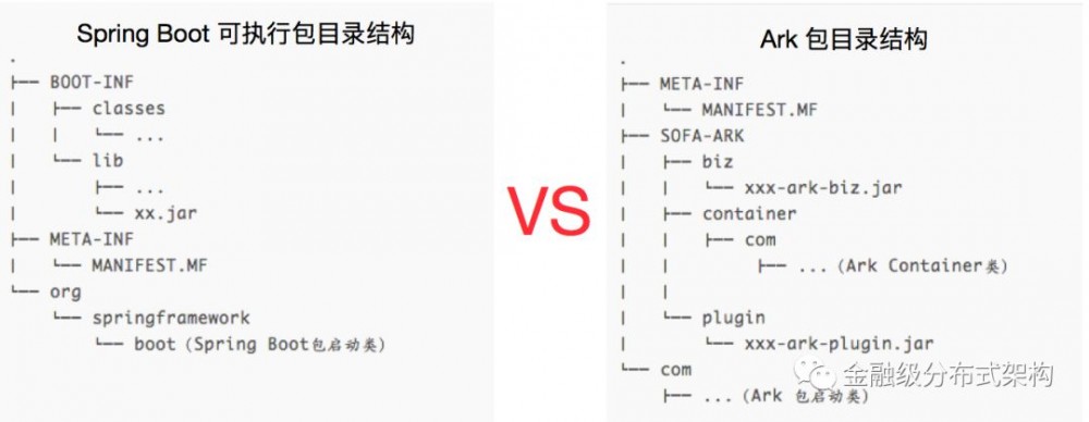 将应用打包成一个具有类隔离能力的可执行 FatJar,称之为 Ark 包。下图是粗略地对比两者的目录结构差别: