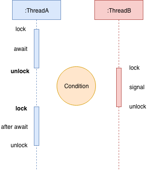 注意ThreadA中被加粗的unlock和lock,调用条件变量的await方法时,虽然没有显式调用unlock和lock,但是内部其实是做了类似的事情的。