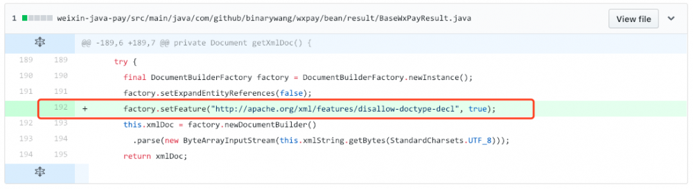 以WxJava的XXE注入漏洞为例,漏洞发现者在项目Github仓库中提交 Github issue#903 ,并提供了 修复参考 。