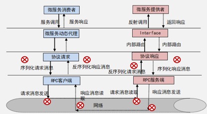 在传统的单体架构中,业务服务调用都是本地方法调用,不会涉及到网络通信、协议栈、消息序列化和反序列化等,当使用 RPC 框架将业务由单体架构改造成分布式系统之后,本地方法调用将演变成跨进程的远程调用,会引入一些新的故障点,如下所示: